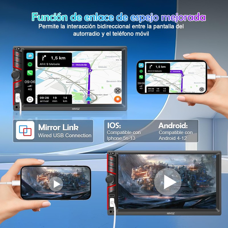 - 【USB Mirror Link】 La función Wire Mirror link admite enlaces espejo y navegación para la mayoría de los teléfonos Android y iPhone. Puede conectar el teléfono inteligente al estéreo a través del cable de datos del móvil, conecte y sincronice fácilmente cualquier contenido como (video, música, navegación gps, etc.) al reproductor de automóviles que se muestra en la pantalla grande.