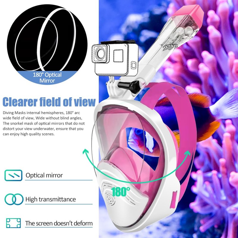 - 🐳【Panoramic View And Support Camera Assembly】 Our snorkel mask can provide a 180°snorkeling experience with no blind spots, allowing a really wide and clear 180°view underwater. So you won't miss the lovely fish and sea creatures that are not directly in front of you. This snorkel mask set is compatible with sports camera mounts, with the removable motion camera mount that allows you to capture every wonderful moment in the sea and share it with your friends.
