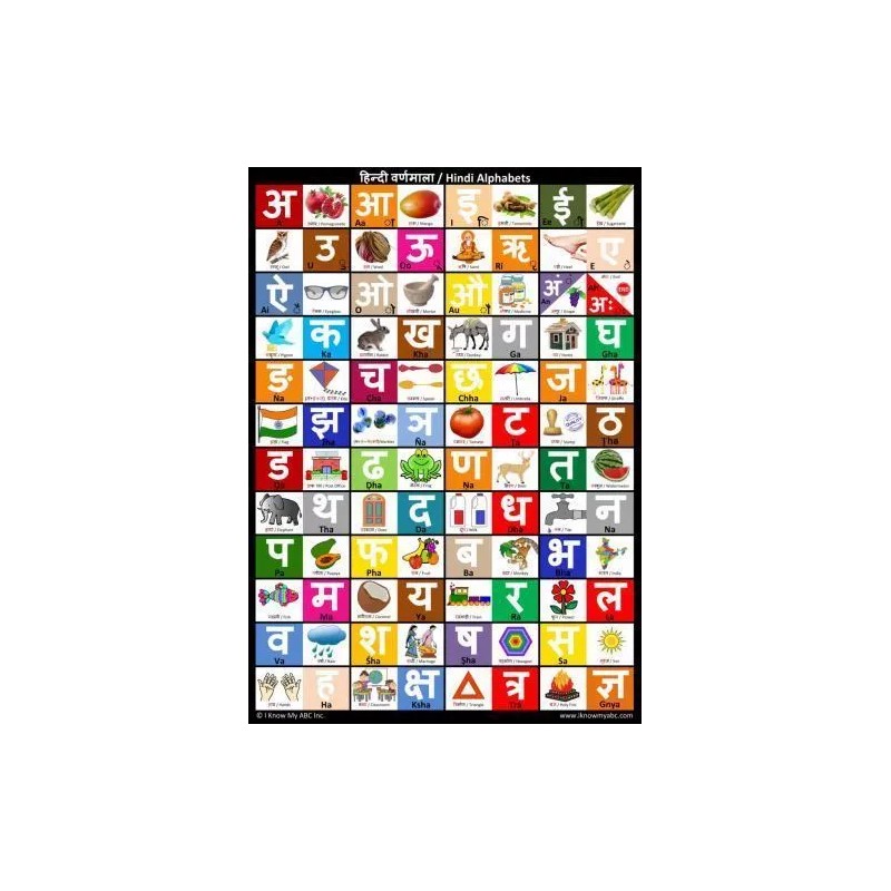 • Colorful chart for learning Hindi vowels and alphabets. This Hindi alphabet chart is aimed to make learning easy for first time Lerner by providing each Hindi alphabet with picture of associated object, pronunciation and bilingual word. Teach Hindi alphabets with this 17 inch x 24 inch alphabet poster.