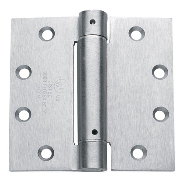 High Quality Pair of Commercial Satin Chrome Steel 4" x 4" inches square hinges. Adjustable Spring Hinges. Includes matching screws, 4 holes template, gauge .106" (2.7MM). Typical use: 1 5/8" - 1 3/4" thick doors. Also known as self-closing hinges or door closing hinges.