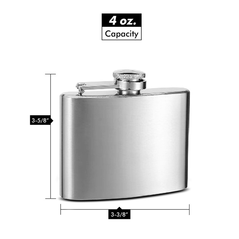 - This flask is made of rugged stainless steel, measures 3 5/8 high by 3 3/8" wide, and holds 4 oz.