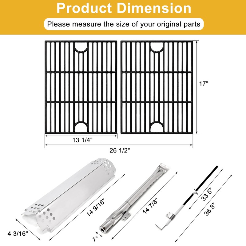 - 【Package Included】- This Nexgrill replacement parts kit includes: ✅5 x Stainless Steel Heat Plates - Dimension: 14 9/16" x 4 3/16".✅5 x Burners - Dimension: 14 7/8" x 1. ✅2 x Cast Iron Cooking Grates - Dimension: 17" x 13 1/4" each, 17" x 26 1/2" for 2 Pcs. ✅ 5 x Ignitors - Dimension: 33.5"