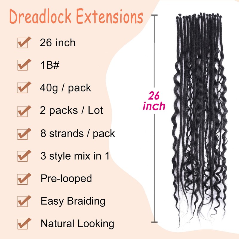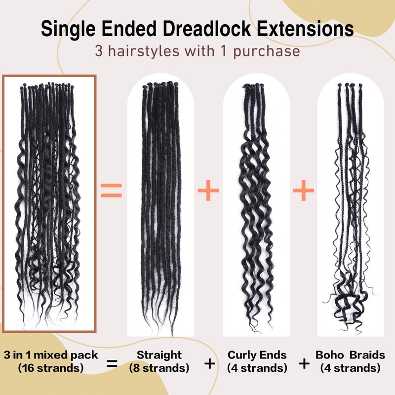 - Package: 26 inch Single Ended: Straight Dreads * 8pcs + Wavy Dreads * 4pcs + Boho Box Dreads * 4pcs;totally 16 locs in each pack.This perfect blend allows you to create a unique look that showcases your individuality. Each strand is meticulously crafted to complement your style, making it easy to achieve a chic and trendy appearance.