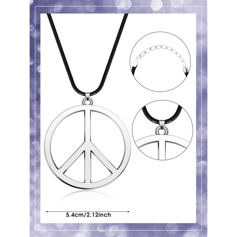- Peace sign necklace: the necklace features a silver peace medallion (approx. 2.1 inch/ 5.4 cm in diameter) with a black faux leather rope and a lobster claw clasp