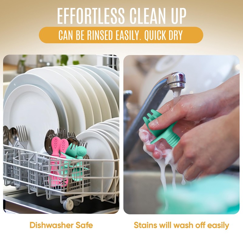 - EFFORTLESS CLEAN-UP: Made of high-quality food-grade silicone material, our baby silicone feeding set is very easy to clean up and will leave no stains. Simply, place the set in the dishwasher and they will come out clean and sanitized. These toddler spoons and forks are also lightweight and easy to hold, making it perfect for on-the-go meals.