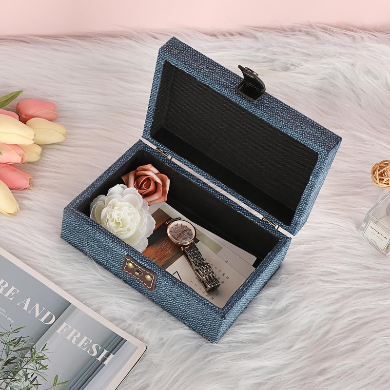 Hipwie Treasure Chest Jewelry Box - Wooden Decorative Box with Clasp Linen Covered Memento Case Box Rectangular Keepsake Box Photos Storage Organizer Home Decor,Blue