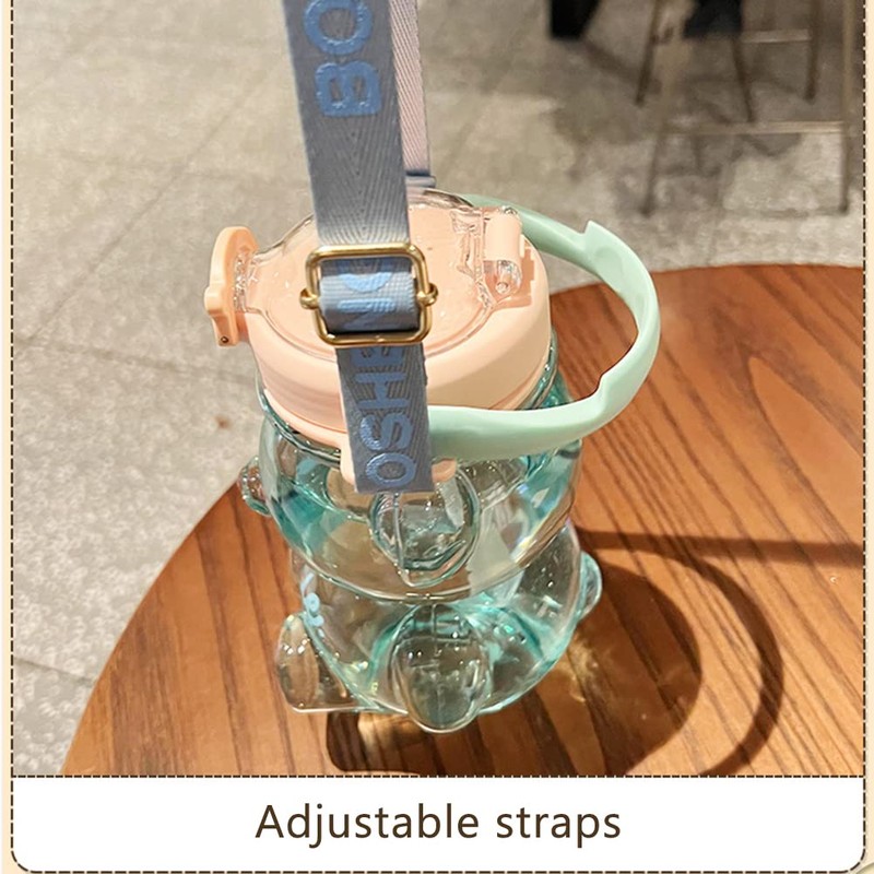 Adorable straw cups with adjustable and removable shoulder straps and a lid with a seal to ensure no water leaks during mixing to ensure a comfortable ride.