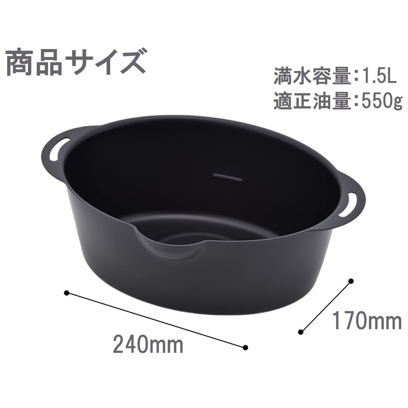 - Size: Total length 6.7 x 9.4 x 3.1 inches (17 x 24 x 8 cm); Inner dimensions 5.9 x 7.9 inches (15 x 20 cm); Bottom surface 4.7 x 6.7 inches (12 x 17 cm); Full capacity 0.5 gal (1.5 L); Suitable oil content approx. 5550 g)