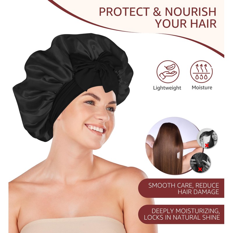 - Comfortable, Lightweight & Breathable: Crafted from premium lightweight satin, this bonnet offers superior comfort and breathability for stress-free sleep in any season. Rest assured knowing your hair is protected without overheating or discomfort.