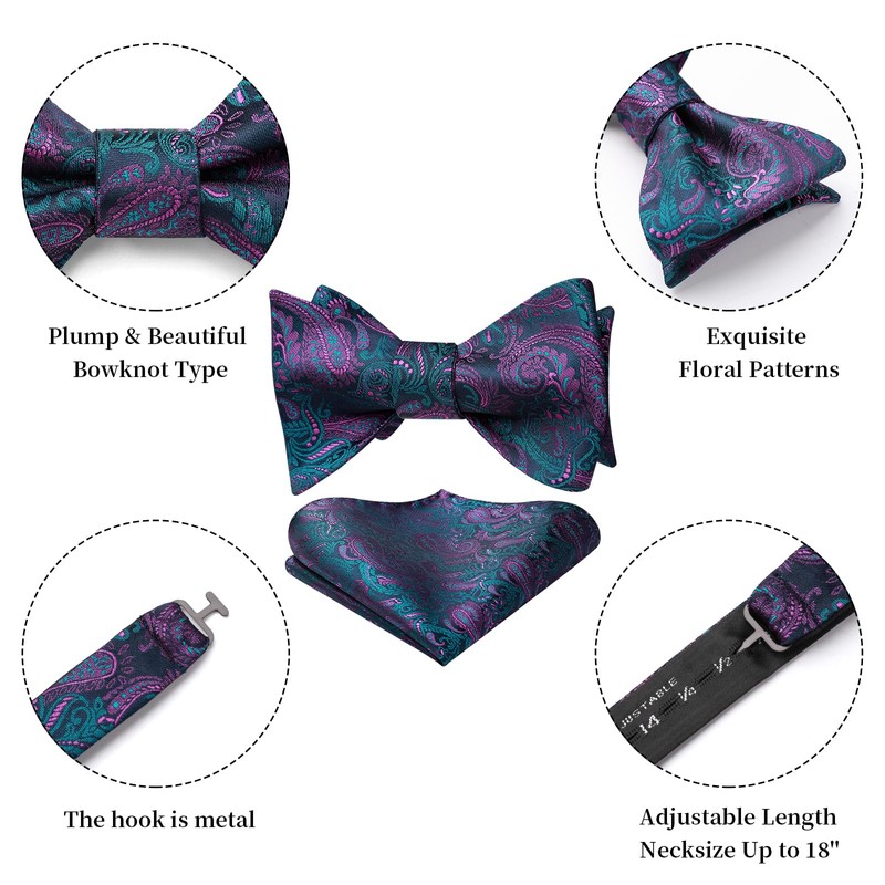 Excellent material: the paisley bow tie is made of a very classy looking and soft comfortable microfiber material, which has a nice silk-like sheen satiny but no shinning, and wrinkle-free after several re-tyings. The self-tied paisley bow tie can be adjusted in quite a few different ways for a perfect & strong held-up bow tie knot to enhances your personality. The quality of the pocket square is also good, which could hold nicely shape even after several wearing.
