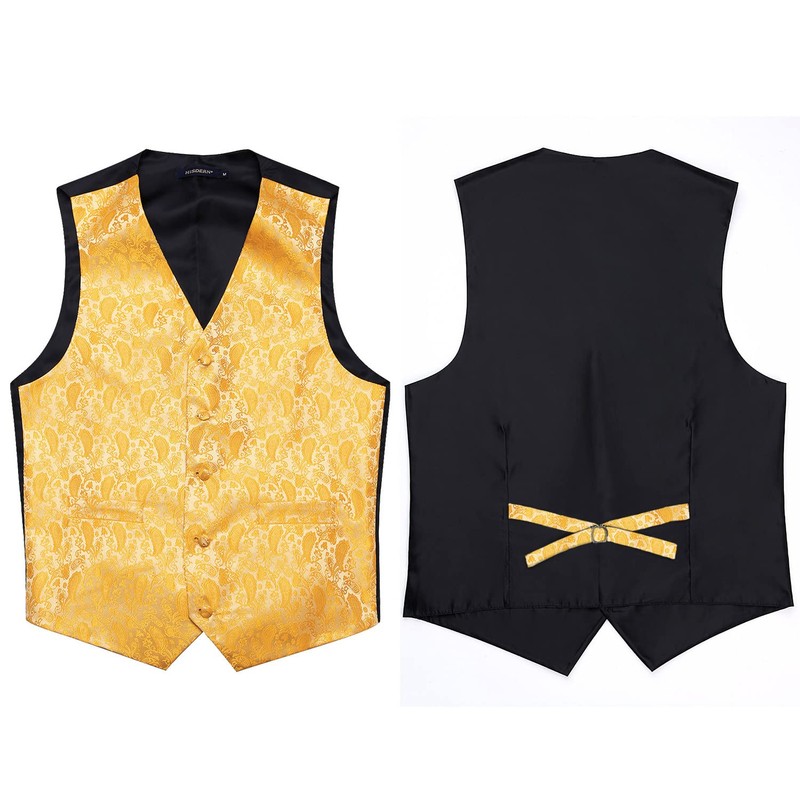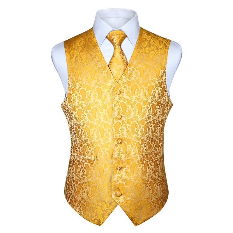 Hisdern Men's Paisley Wedding Party Waistcoat Necktie Pocket Square Handkerchief Jacquard Vest Suit Set , Deep Yellow, L(Chest size 46 inch)