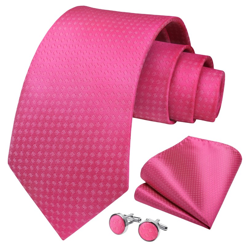 HISDERN Men's Wedding Ties and Pocket Square Solid Tie Cufflinks Set, Hot Pink-1