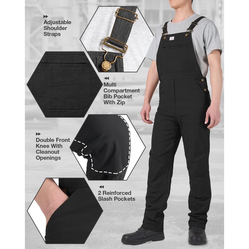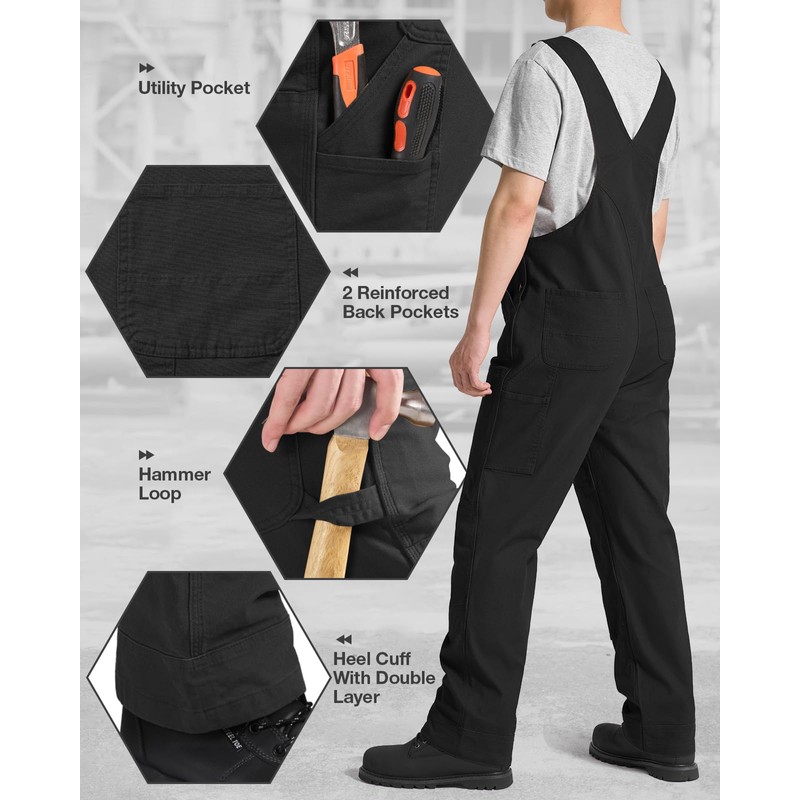 - Multi-Pocket System: This men's stretch canvas overalls feature a zippered bib pocket, 2 slant pockets, 2 back pockets, a tool pocket and a hammer loop. The 6 Useful Packets keeping all your essentials within easy reach. Reinforced stitching on the pockets prevents tearing, ensuring long-lasting durability for daily use.
