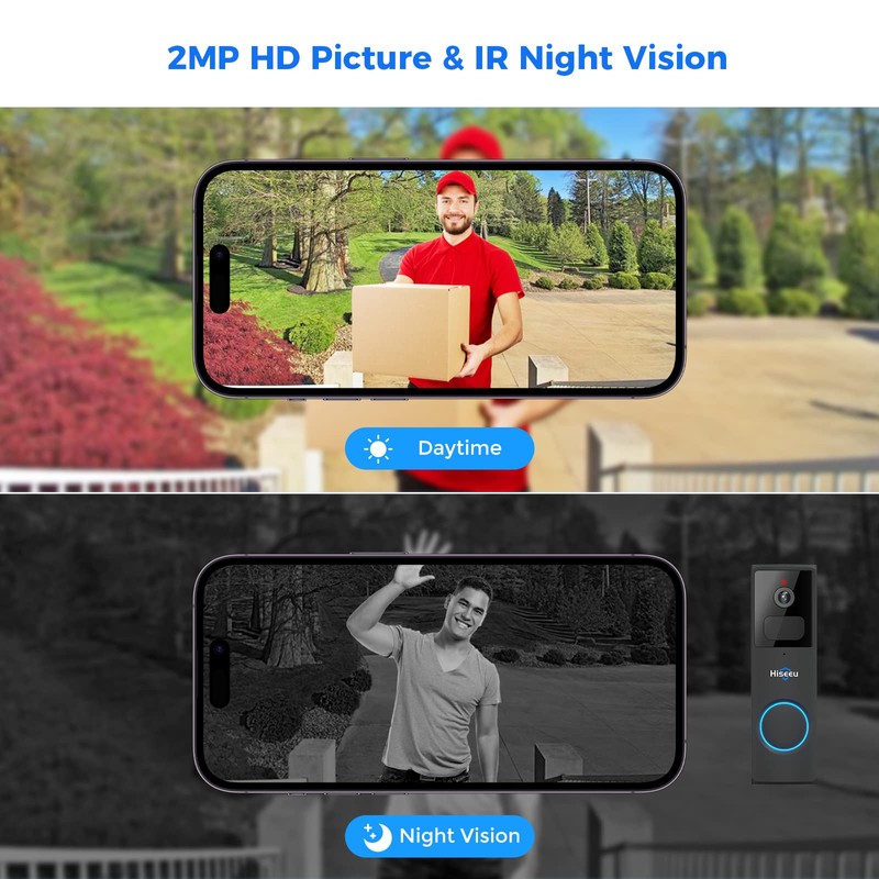 • FHD 1080P Picture & Clear IR Night Vision--- Hiseeu Video Doorbell designed with 1080P HD resolution and wide angle lens which helps wireless video doorbell to record the motion of the front door without missing any clip. With extreme clear IR night vision, Hiseeu wireless WiFi camera doorbell sends you high quality picture during the night time. And door bell will automatically switch for night vision according to light changes.