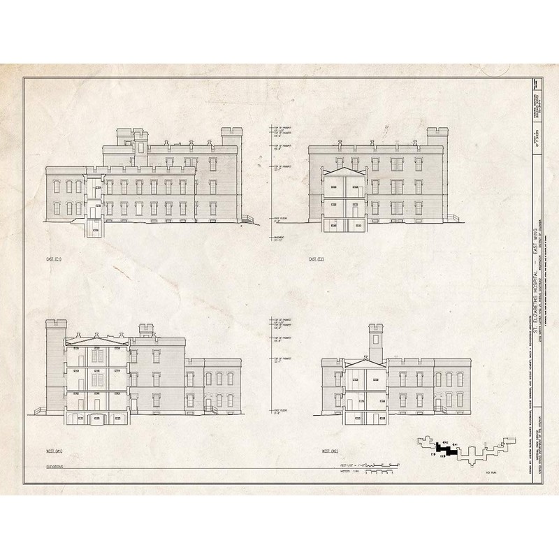 Historic Pictoric : Blueprint 7. East & West Elevations - St. Elizabeths Hospital, East Wing, 539-559 Cedar Drive, Southeast, Washington, District of Columbia, DC 24in x 18in
