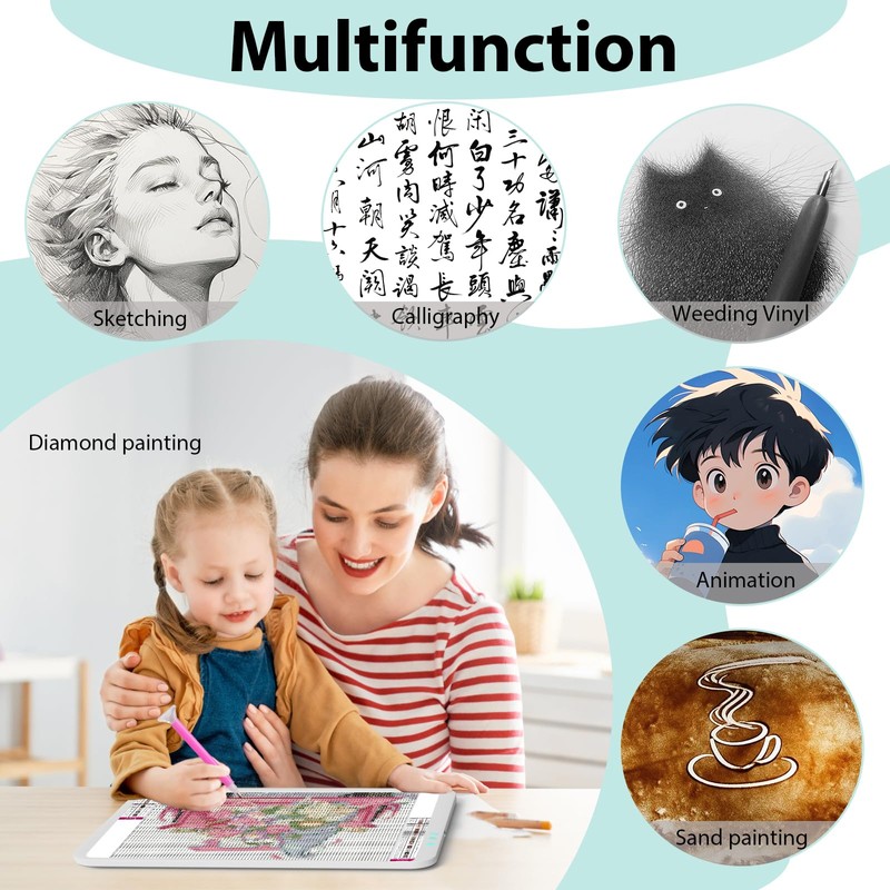 • <๐—™๐—ฎ๐˜€๐—ต๐—ถ๐—ผ๐—ป๏ผ†๐—•๐—ถ๐—ด ๐—”๐Ÿฏ>: The diamond art light pad boasts a chic design in white and mint green, radiating modernity and sophistication, enhancing the visual appeal of the device while infusing a sense of freshness and sophistication into any workspace.And the light pad is designed to be highly portable with L16.2''ร—W12.2''ร—H0.3''.The visual working area is 14.8''x10.6'',which is much bigger than A4 size,perfect for diamond painting and drawing.lt's a perfect gift for Christmas, birthdays or any other festivals.