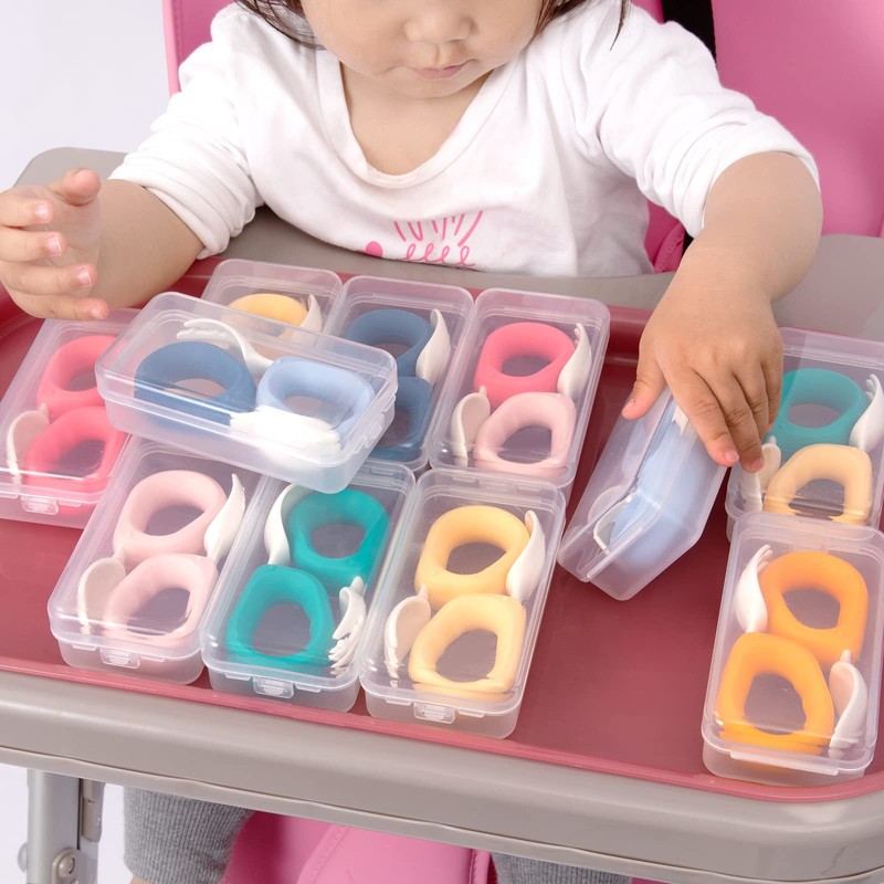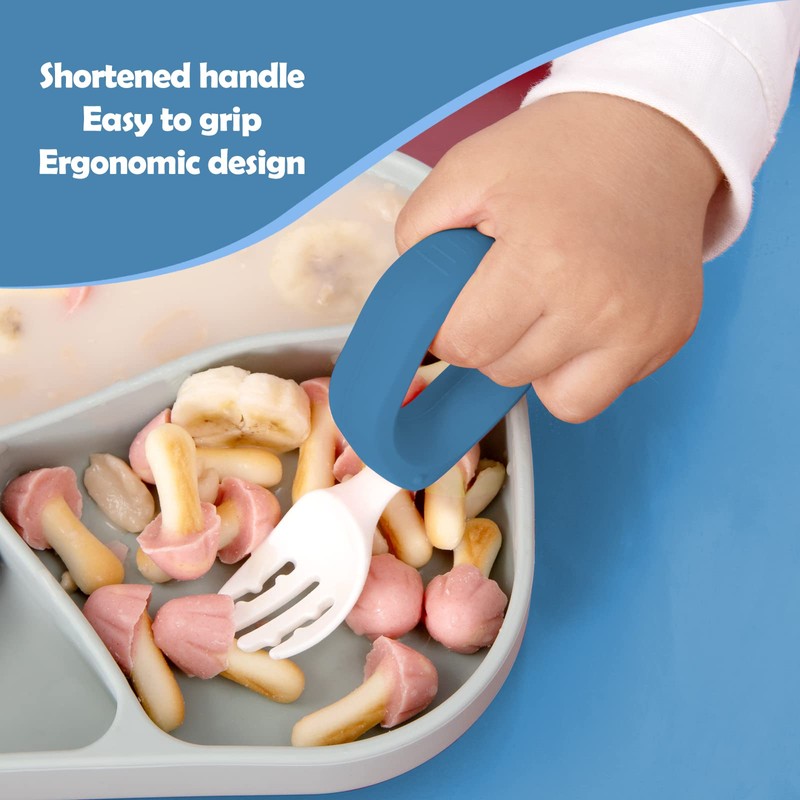 HIWOOD Juego de cuchara y tenedor de aprendizaje automático para bebés con estuche de viaje, sin BPA, lindo círculo de entrenamiento para niños, silicona y ABS, gran juego de vajilla (azul)