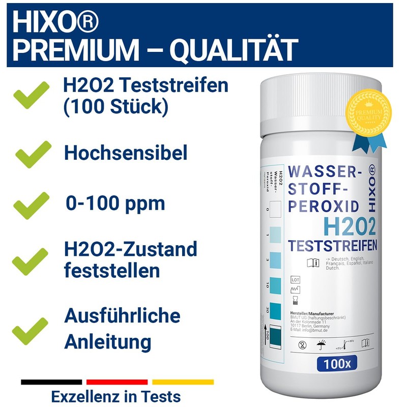 HIXO 100 x H2O2 Test Strips - Hydrogen Peroxide Water Test for 0-100ppm - Measure Concentration - Quick & Easy Application - Includes Colour Scale