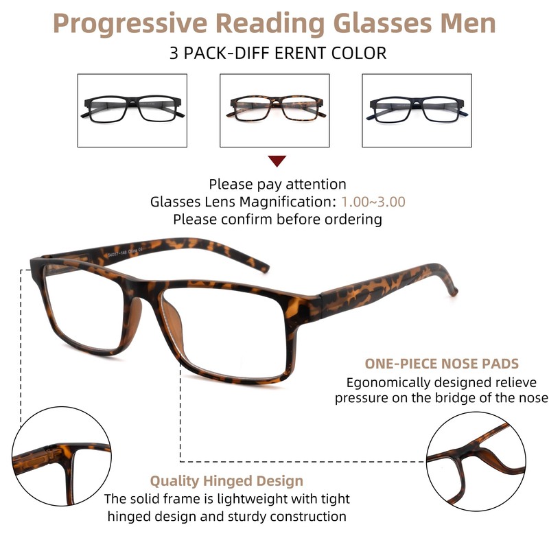• ▶【3 PACK PROGRESSIVE READERS】Progressive reading glasses come in a variety of colors: black, tortoiseshell, blue. Suitable for all kinds of facial men forms. You can think of progressive glasses as two pairs of glasses in one: a pair of scratch-resistant reading glasses for everyday wear, and a pair of anti-blue light-blocking glasses for reading.Multifocal reading glasses for men for indoor or outdoor, all-weather wear, and people with presbyopia problems.