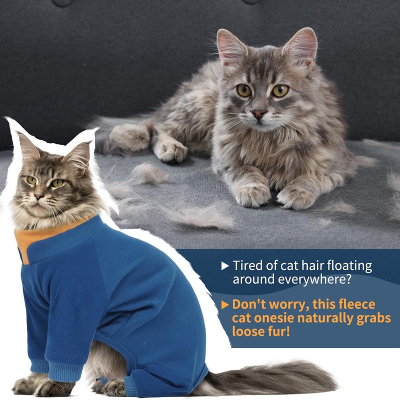 Hjumarayan Cat Onesie, Full Coverage Warm Fleece Jumper with Four-leg Sticky Hair Clothes, Soft Long Sleeve Cat Recovery Suit Stretchy Body Suit to Stop Licking, Blue M