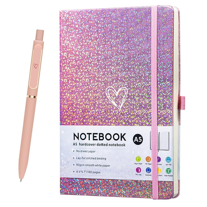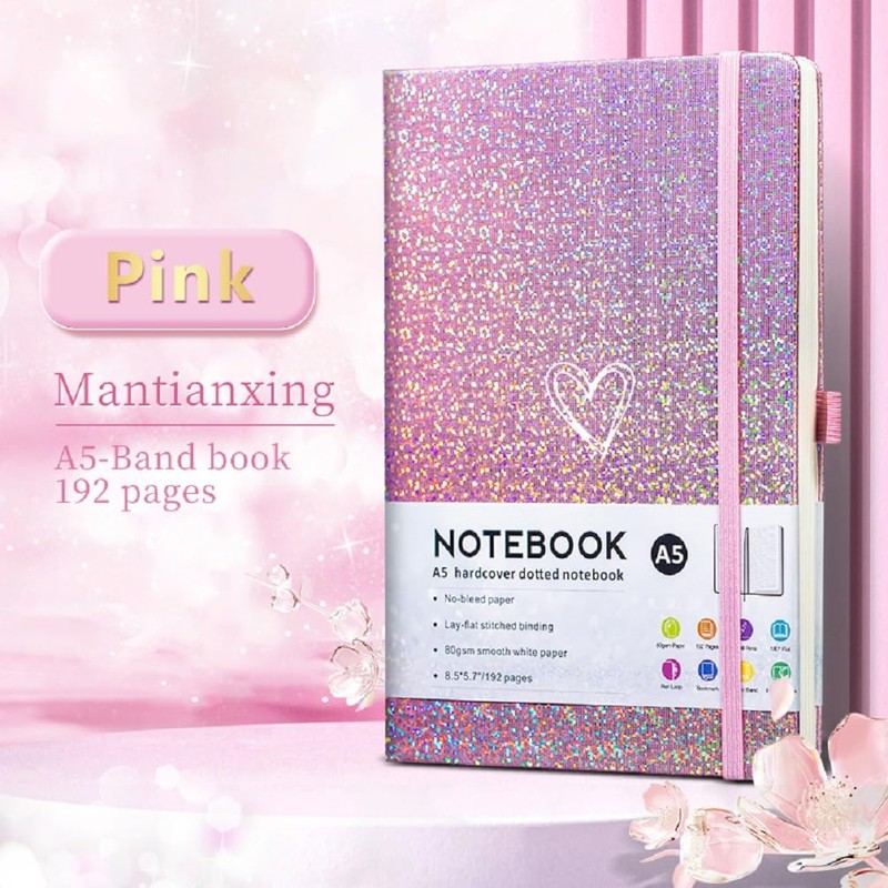 - 【Bling Hardcover Journal Notebook&Cute Pen】This A5 ruled journal notebook features a hardcover leather cover,Leather feels soft and comfortable,inner ribbon bookmark and elastic closure band,for all your writing,note-taking, traveling, etc. At the same time,Sized at 5.8"x8.4", this medium A5 notebook is easy to carry for convinient writing
