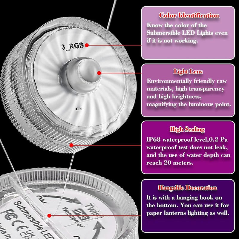 - CUTE ATMOSPHERE : The Submersible Led Lights Built-in spotlight mirror, makes this mini led lights give off a more intense glow.Perfect for event, party, lighting up vases and any water filled table centerpiece. It can create a great atmosphere indoors and outdoors when you are partying with your family or friends