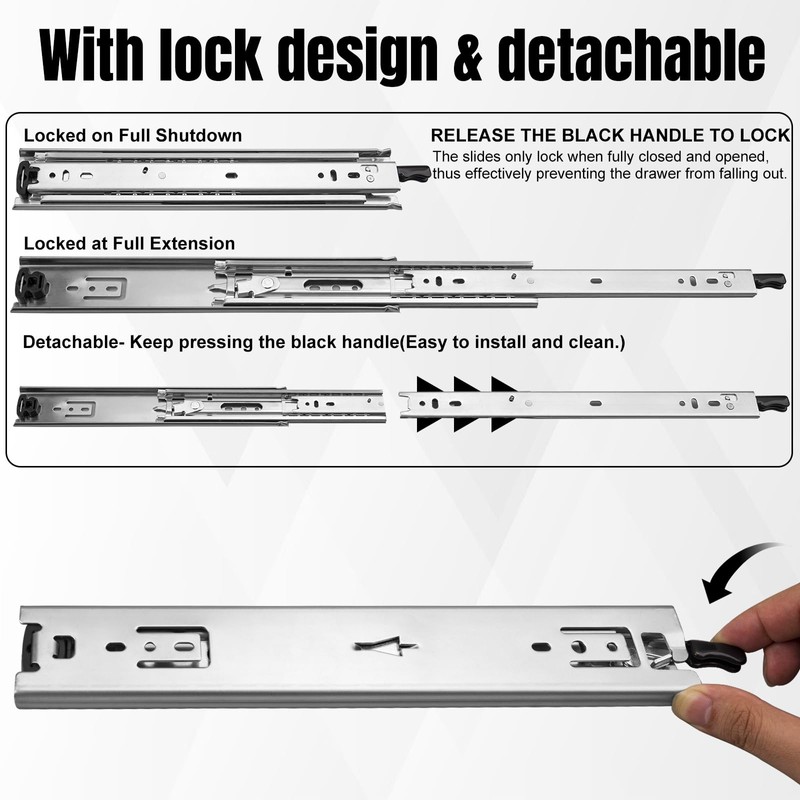 • 【With hold-still lock & Detachable】 There is a black handle to lock-in and lock-out .When it is fully extension or fully closed,the slides will be hold still automatically (in locking state), and no chance of drawer separating from the cabinet.Press the lock handle gently,it's unlocked and get back in free sliding.A double row of ball-bearing action provides a smooth slide performance when closing and opening the drawer.