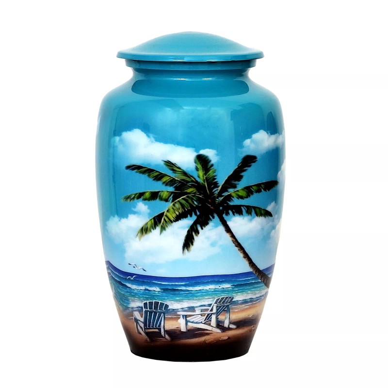- GIVE YOUR LOVED ONE THE RESPECT THEY DESERVE - When you've lost someone you need a premium quality urn to hold their ashes and act as a fitting tribute to the love you shared. This beautiful Lovely Beach Blue Cremation Urn for Human Ashes. Size - 10.5" H x 6" W x 6" L. Material: Aluminum Metal, velvet bag . cremation urn is handcrafted to give your loved one's remains the superior quality they deserve.