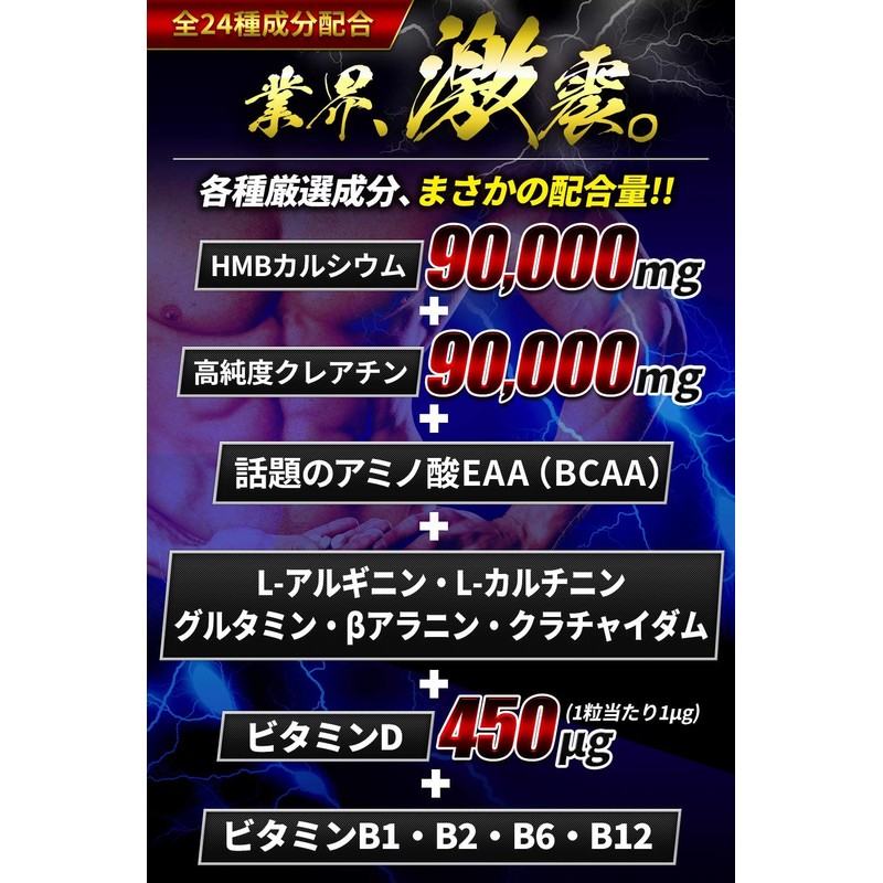 - ⚡超大型リニューアルしました!HMBカルシウム90,000mg+クレアチン90,000mg+EAA(BCAA)+Lアルギニン+Lカルニチン+グルタミン+βアラニン+クラチャイダム。さらにビタミンD:450μg、ビタミンB各種を配合したマルチサプリメント。