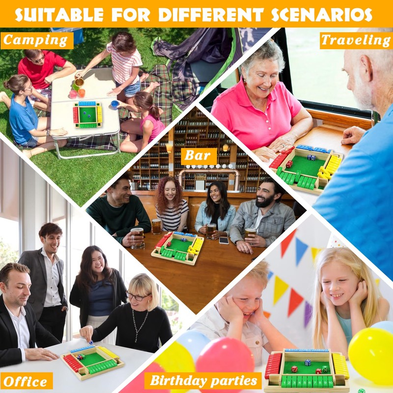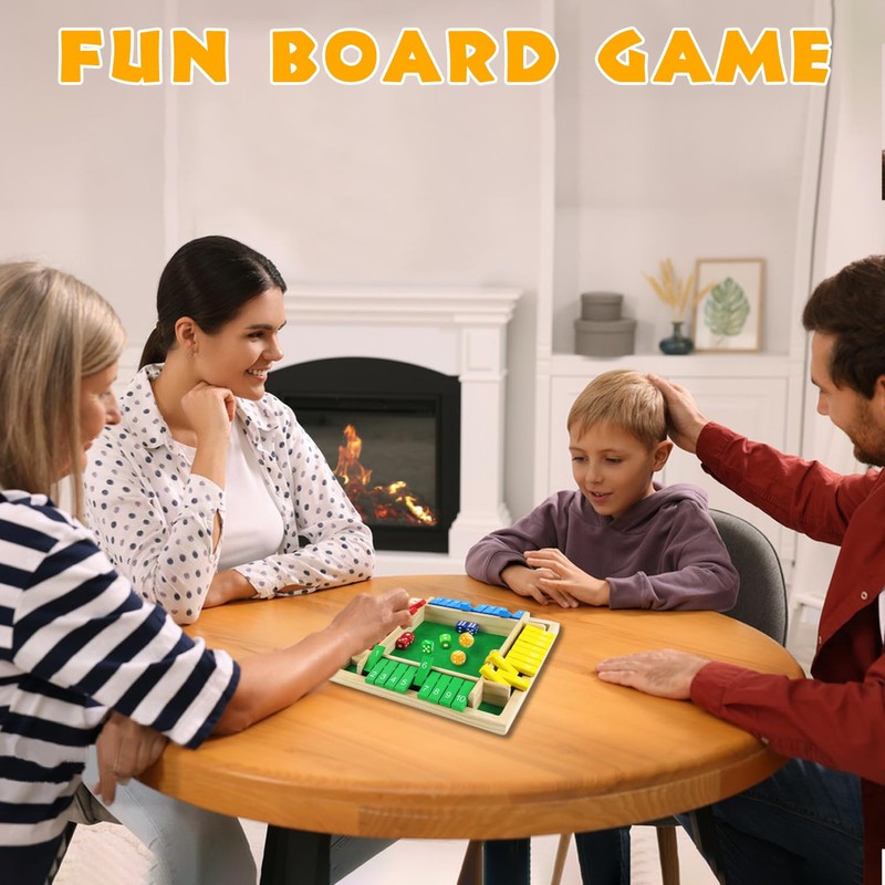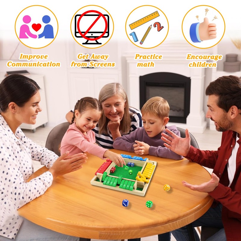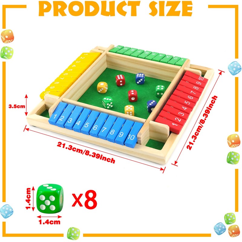 - Shut the Box Game for 4 Players: This Shut The Box dice game is designed for 1-4 people and features 10 silk-screen printed wooden number blocks on each side. Players can roll and calculate to get their numbers from 1 to 10. The wooden game contains a dice plate and a set of 8 solid wooden dice, which is an interesting traditional game