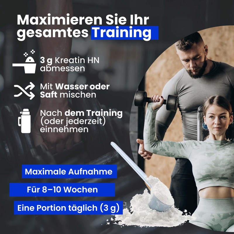• Easily soluble & neutral in taste: fine powder structure for quick dissolution in water, juice or shakes - without lumps or aftertaste. How to use: Creatine powder HN should be taken 1 dose per day (3 g), preferably after training and on rest days, at any time for 8-10 weeks.