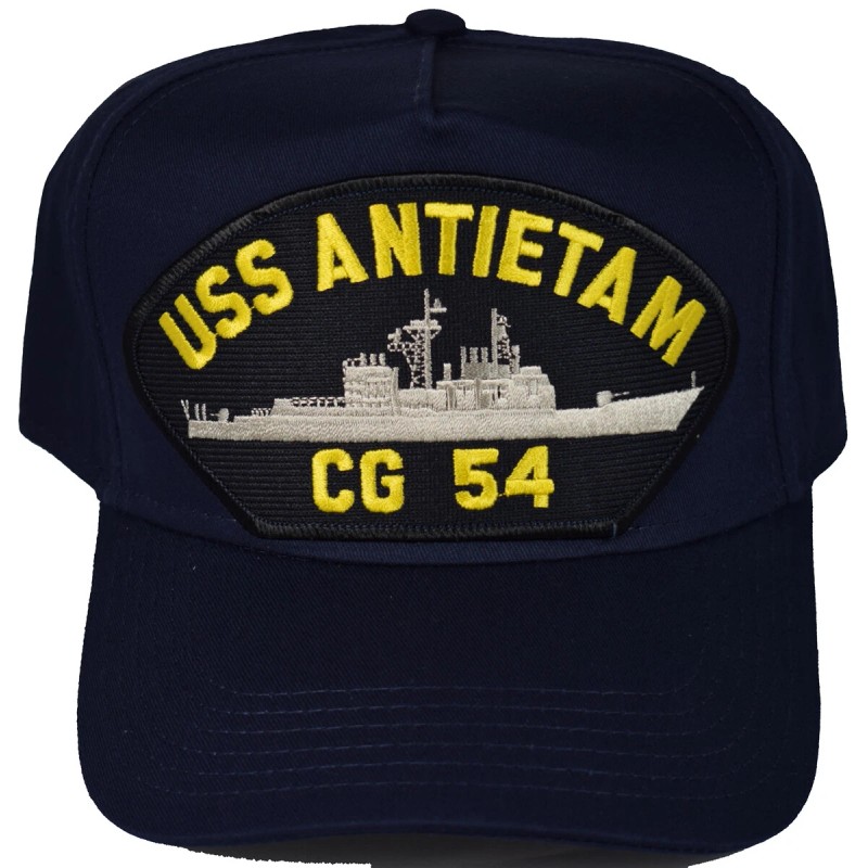 USS ANTIETAM CG 54 SHIP HAT - NAVY BLUE - Veteran Owned Business. Navy Blue Cap High Detail and Impact - USS ANTIETAM CG 54 SHIP HAT. 8 Rows Stitching on Visor and Pro Stitch on Crown 5 panel hat. USS ANTIETAM CG 54 SHIP HAT - Adjustable Size, Navy Blue Golf Style. HatnPatch Is THE Veteran Owned and Operated Family Business - 2 Generations of Retired Marines - We Ship Your Order Within 24 Hours And Usually The SAME DAY!