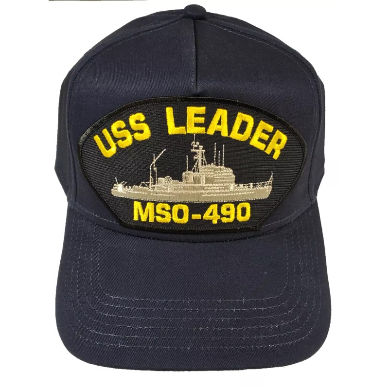 USS LEADER MSO-490 SHIP HAT. Minesweeper. Navy Blue Cap High Detail and Impact. 8 Rows Stitching on Visor and Pro Stitch on Crown 5 panel hat. Adjustable Size, Navy Blue Golf Style. Great Gift Idea for ANYONE; especially those who served on the USS LEADER. HatnPatch Is THE Veteran Owned Family Business. We Generally Ship Orders Within 24 Hours And Usually The SAME DAY!