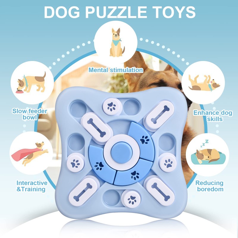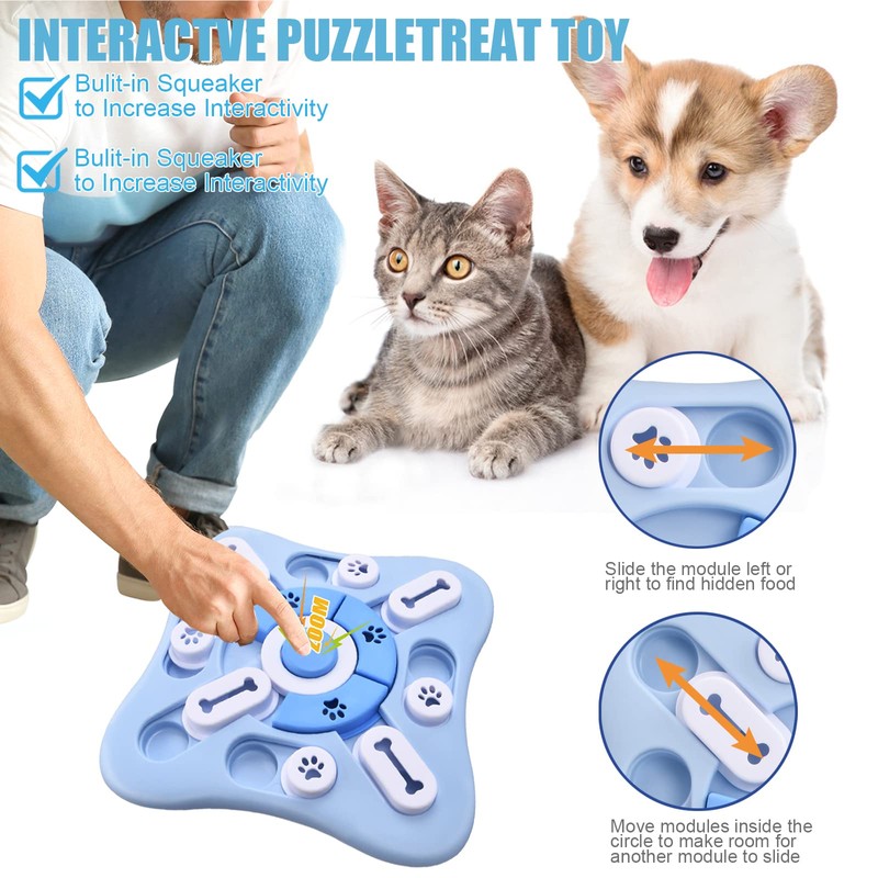 - INTERACTIVE DOG PUZZLE TOY This is a fun interactive puzzle toy that can encourage and train your dogs or cats to search for food by pushing the slider. By combining a circular orbit glide and a linear orbit gliding game, intelligent dog and cat must move the slider correctly to get the food reward hidden in the maze. Makes your pet think quickly and increases IQ.