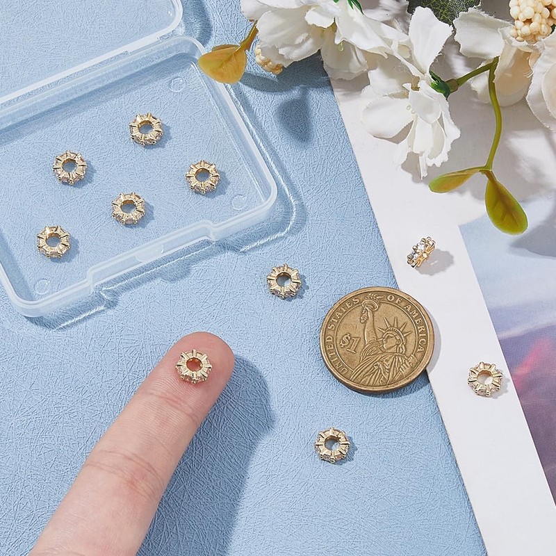 - Pack of 10: you will receive 10 gold round spacer beads with zirconia, approx. 8 mm diameter, 2.5 mm thick, hole: 2.5 mm.