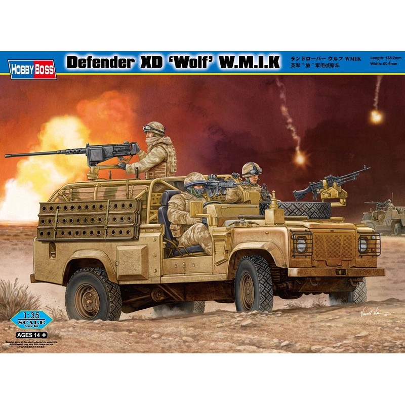 Militarized version of the Land Rover Defender 110 4x4 Truck Utility Medium, reconnaissance and close fire support variant with 'Weapons Mount Installation Kit'. Model features well detailed chassis (frame, full 300 Tdi engine, drivetrain and suspension), driver and fighting compartment interiors, vinyl tires, separate hood and on-vehicle equipment, WMIL roll cage, PSP panel, detailed weapons (ring mounted 12.7 mm heavy MG, pintle mounted FN MAG 7.62 mm GPMG and 2 rack mounted L85 rifles).