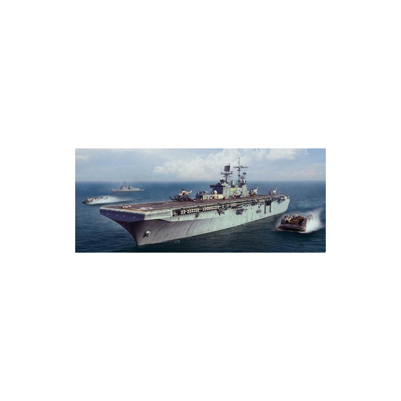 Modern US Navy Wasp class multipurpose amphibious assault ship. Kit features choice of full or waterline hull, excellent exterior surface detail, multi- level superstructure island, separately molded transom ramp doors, ship's boat and rigid-inflatable boat, optional position deck elevators, dry dock inspired display stand and photo-etch parts (including railings, radar antennae, catwalks, safety netting and nameplate). Also includes extensive assortment of vehicles and clear-molded aircraft: CH-46E Sea Knight helicopters (x4), CH-53E Super Stallion helicopters (x4), SH-60F Seahawk helicopters (x2), MV-22 Ospreys (x4), AH-1W Cobras (x2), AV-8B Plus Harriers (x2), LCAC assault hovercraft (x2), M1114 Humvees (x2), M1097 trucks (x2), LCU landing craft (x2), AAV7s (x2), LAV-25s (x2), M60A3 Patton's (x2), M1A1 Abrams (x2), MTVRs (x2) and M198 towed artillery (x2), deck tractors, crash truck and flight deck crane.