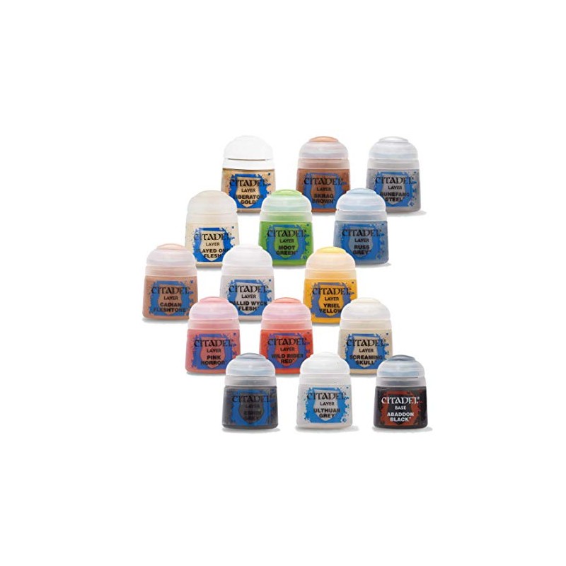 Now you can quickly and easily buy all of your Citadel paints and accessories in one low-cost area! This style contains every Layer paint, plus a few extra options. The layer paints include: Administratum Grey, Ahriman Blue, Alaitoc Blue, Altdorf Guard Blue, Auric Armour Gold, Baharroth Blue, Balor Brown, Baneblade Brown, Bestigor Flesh, Bloodreaver Flesh, Blue Horror, Brass Scorpion, Cadian Fleshtone, Calgar Blue, Castellax Bronze, Dark Reaper, Dawnstone, Deathclaw Brown, Deathworld Forest, Dechala Lilac, Deepkin Flesh, Doombull Brown, Dorn Yellow, Elysian Green, Emperor's Children, Eshin Grey, Evil Sunz Scarlet, Fenrisian Grey, Fire Dragon Bright, Flash Gitz Yellow, Flayed One Flesh, Fulgrim Pink, Fulgurite Copper, Gauss Blaster Green, Gehenna'S Gold, Genestealer Purple, Gorthor Brown, Hashut Copper, Hoeth Blue, Ironbreaker, Kabalite Green, Kakophoni Purple, Karak Stone, Kislev Flesh, Knight-questor Flesh, Krieg Khaki, Liberator Gold, Lothern Blue, Lugganath Orange, Moot Green, Nurgling Green, Ogryn Camo, Pallid Wych Flesh, Phalanx Yellow, Pink Horror, Runefang Steel, Runelord Brass, Russ Grey, Screaming Skull, Skarsnik Green, Skavenblight Dinge, Skrag Brown, Skullcrusher Brass, Slaanesh Grey, Sons of Horus Green, Sotek Green, Squig Orange, Stormhost Silver, Stormvermin Fur, Straken Green, Sybarite Green, Sycorax Bronze, Tallarn Sand, Tau Light Ochre, Teclis Blue, Temple Guard Blue, Thunderhawk Blue, Troll Slayer Orange, Tuskgor Fur, Ulthuan Grey, Ungor Flesh, Ushabti Bone, Vulkan Green, Warboss Green, Warpfiend Grey, Warpstone Glow, Wazdakka Red, White Scar, Wild Rider Red, Word Bearers Red, Xereus Purple, Yriel Yellow, Zamesi Desert.