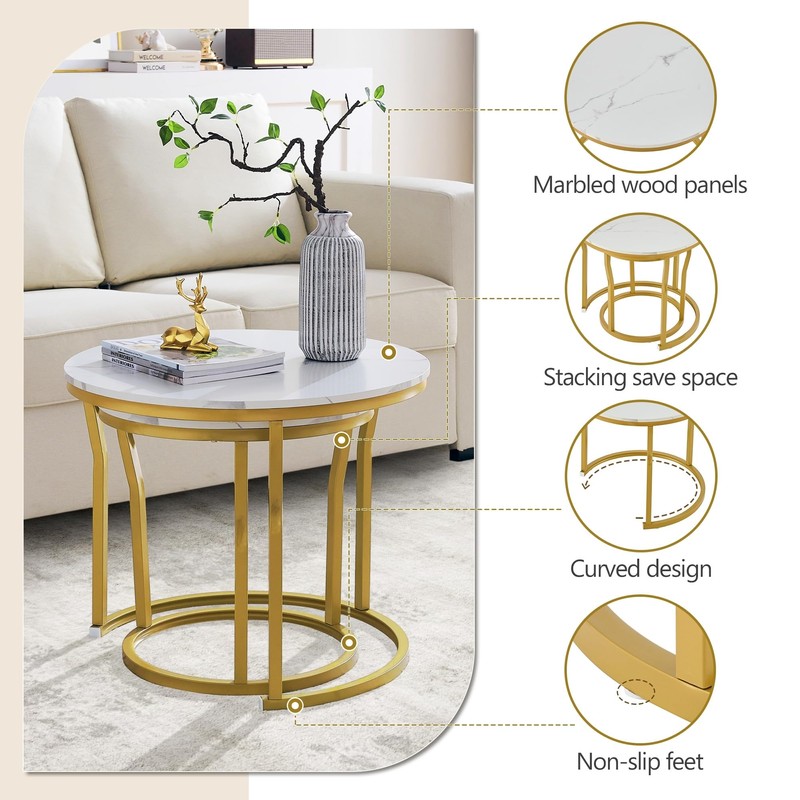Hoctieon Nesting Coffee Tables, Round Nesting Tables Set of 2, End Tables, Stacking Nesting Tables for Living Room, Circle Coffee Tables, Side Tables Wooden Table Top, Gold&White