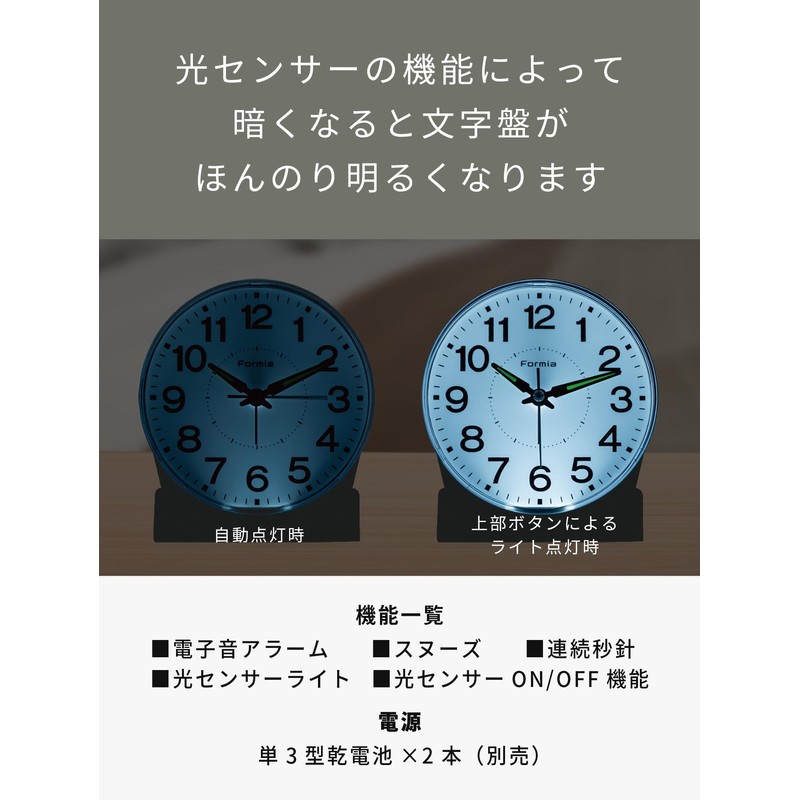 - Functions and Specifications: Electronic sound alarm, snooze function, automatic light on (light sensor type), light, continuous second hand