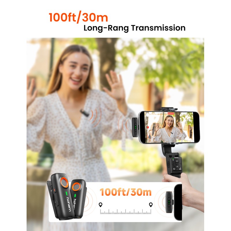 • Long Standby Time: Hohem MIC-01 has a battery life of 7.5 hours per transmitter and up to 20 hours with the charging case. The wireless lavalier microphone can be used for long shoots, presentations, or live meetings. The max transmission range of 100 meters (328 ft.) can used freely in more scenarios such as interviews, live streaming, and vlogging.