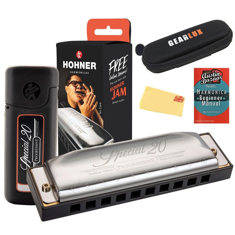THE WORLD'S MOST COPIED HARMONICA DESIGNA unique, beautifully mellow sound, based on a revolutionary concept, the Special 20 was the first diatonic harmonica in the world with reed plates recessed into the comb, creating a projecting plastic mouthpiece. This makes it more comfortable to play, and the most copied harmonica design worldwide. Its distinctive sound is perfect for everything from Folk and Country to Rock and Pop. The Special 20 offers everything a professional harpist needs, but it's also the ideal beginner's instrument thanks to its smooth playability and durability. If you're not just looking for a companion for the first few steps, but one to take you all the way, the Special 20 is your best possible choice.FEATURES:Recessed reed plates -The reed plates are recessed for a more comfortable mouthpieceDurable plastic comb - Reliable performance under all climate conditions thanks to resilient plastic combSpecial cover plates - The cover plates have a small back opening to highlight the warm soundTECHNICAL DETAILSReed plates material & thickness: brass, 0.9 mmReed plates surface: brassReeds number & material: 20 brassComb material & color: ABS, blackComb finish: ABSMouthpiece surface: ABSCover plates: stainless steelKeys: HG, F#, F, E, Eb, D, Db, C, B(H), Bb, A, Ab, G Type: diatonic Tuning: Richter/Country (Country just in F#, F, E, Eb, D, Db, C, B(H), Bb, A, Ab, G) Number of holes: 10 Length: 10.2 cmAustin Bazaar bundles your instrument with necessary accessories! Everything you need to start playing immediately comes in one box. This bundle contains a zip case to keep your harmonica protected, an instructional book is included so you can practice with guidance. An Austin Bazaar polishing cloth is included so you can keep your new instrument in mint condition.