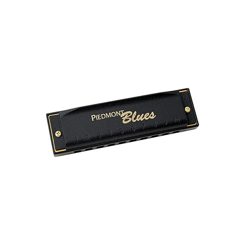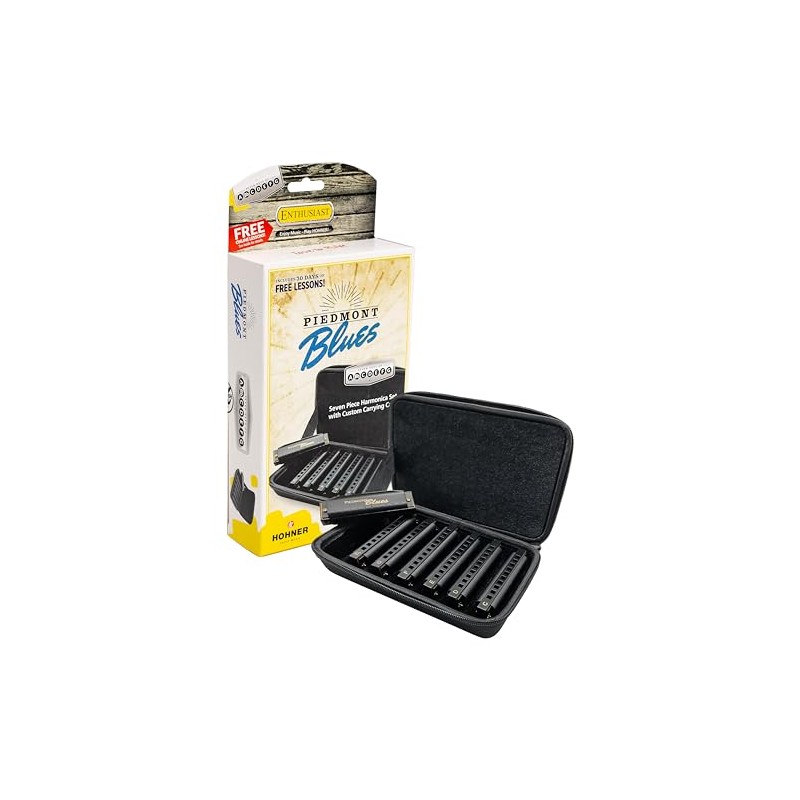 - Includes seven sleek black plastic harmonicas in a durable hard case with the Piedmont Blues logo
