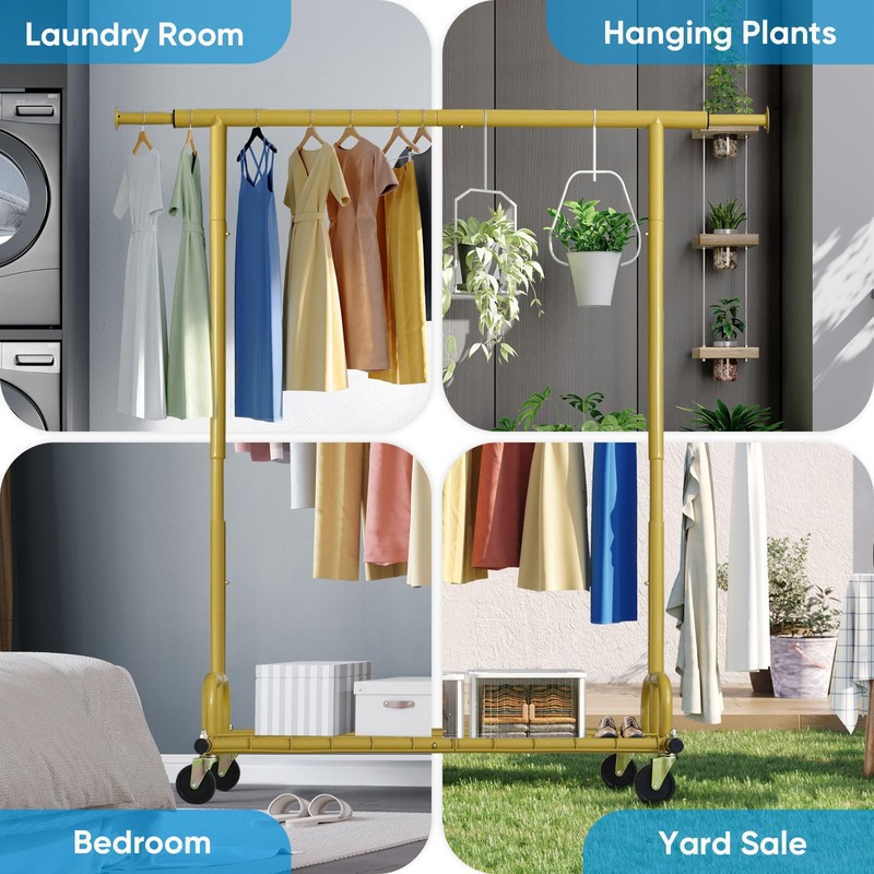 - 【Fit Your Space & Needs】Dimension: 51-75" L x 22" W x 66-71" H. The extensible horizontal rod of rolling garment rack from 51" to 75" provides 1.5 times more space than ordinary single rail garment rack. Height adjustable from 66" to 71" accommodates short and long garments. You can adjust the length and height of rods to meet your space needs
