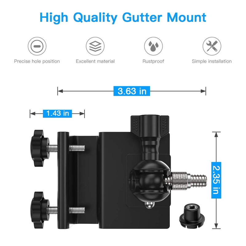 - Easy installation: no special tools or complex work steps are required for installation. Our gutter mount can be installed according to the thickness of the mounting plate (remove the screw on the gutter bracket and replace the up and down direction). The camera is mounted on the gutter floor, simply install into the gutter plate and find the right angle.