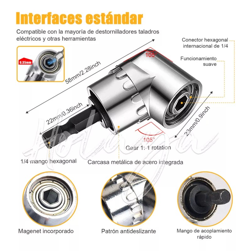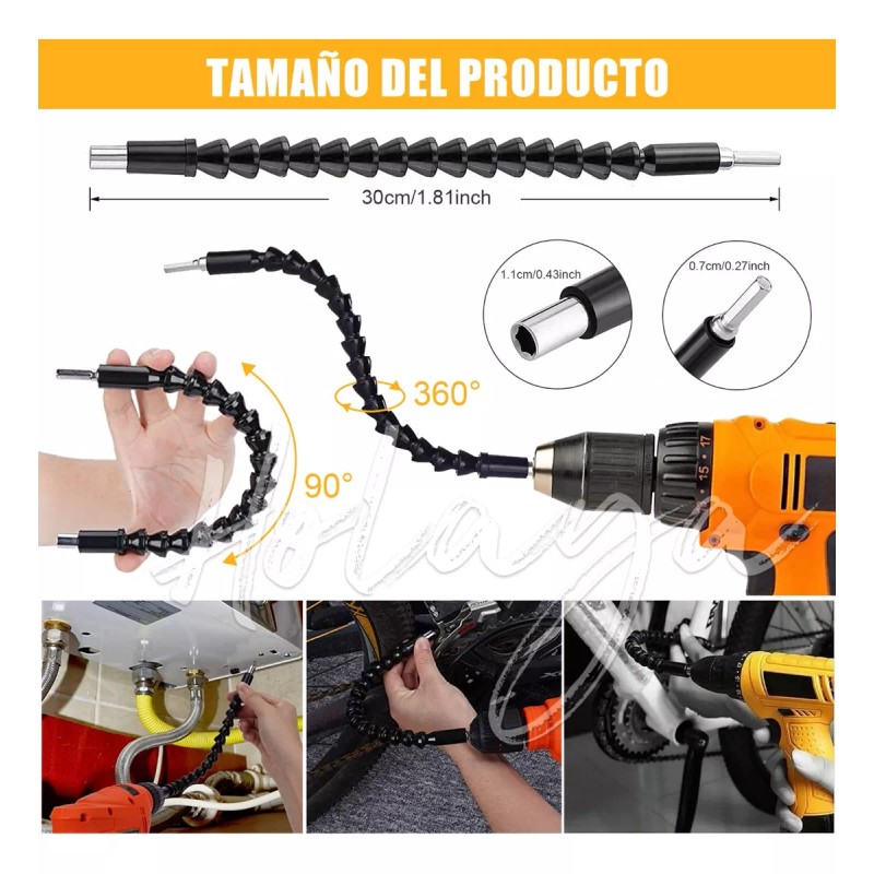 La extensión de la broca flexible y el taladro de ángulo recto de 105 se pueden girar y girar en diferentes ángulos, y se pueden conectar al taladro, taladro recargable o llave manual para extenderlo a lugares estrechos inaccesibles para girar tornillos, tuercas, etc., lo que te ayuda a terminar rápidamente tu trabajo