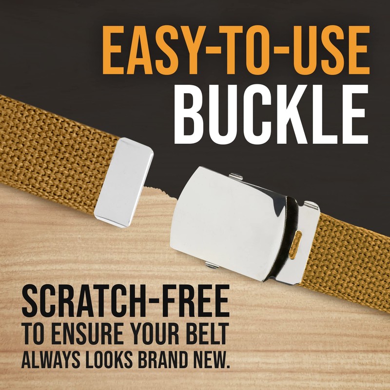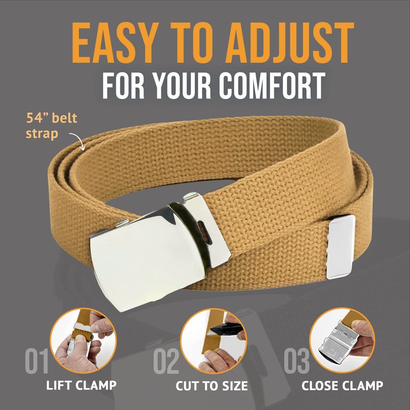 Hold’Em Military Canvas Webbing Belts for MEN’S–Polished Silver Slider Buckle Heavy Duty Adjustable -Tan