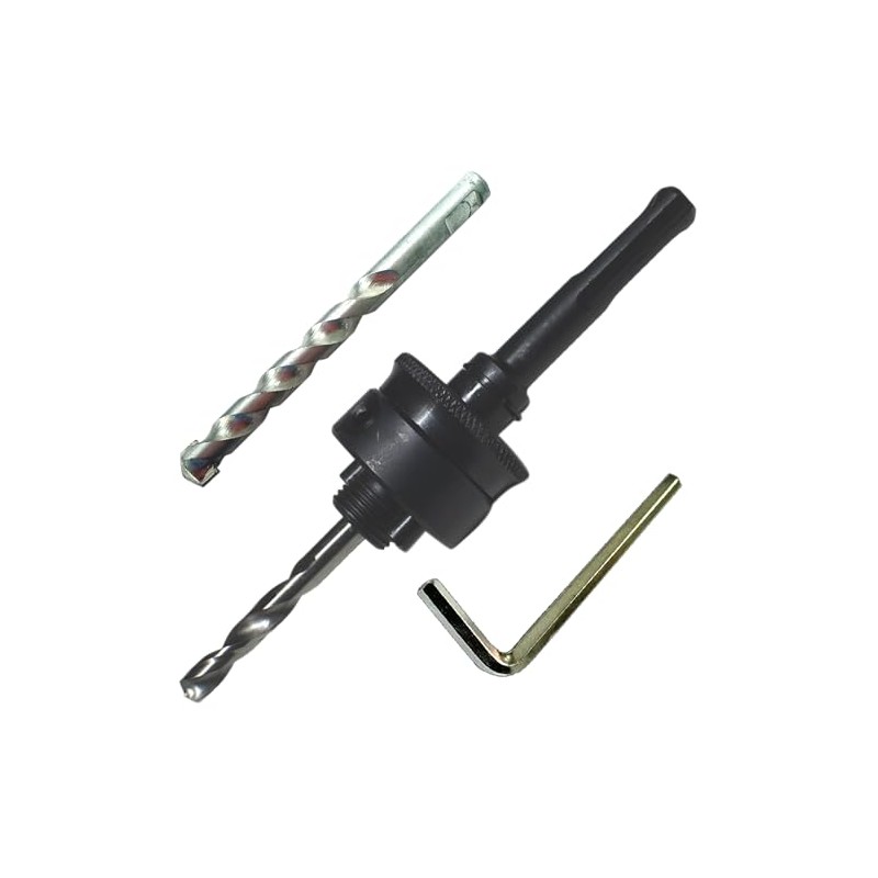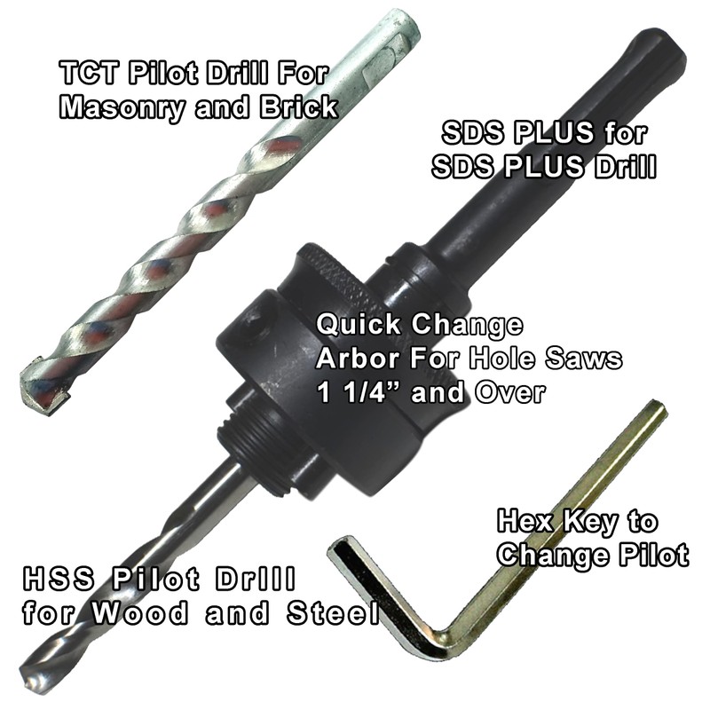 Hole Saw Arbor Quick Change SDS Plus for SDS Plus Chuck Push Pins Into Hole Saw Stays Put Fit Hole Saws 1 1/4" to 8" Hole Saw with TCT Pilot Drill for Masonry and HSS Pilot Drill for Wood and Steel