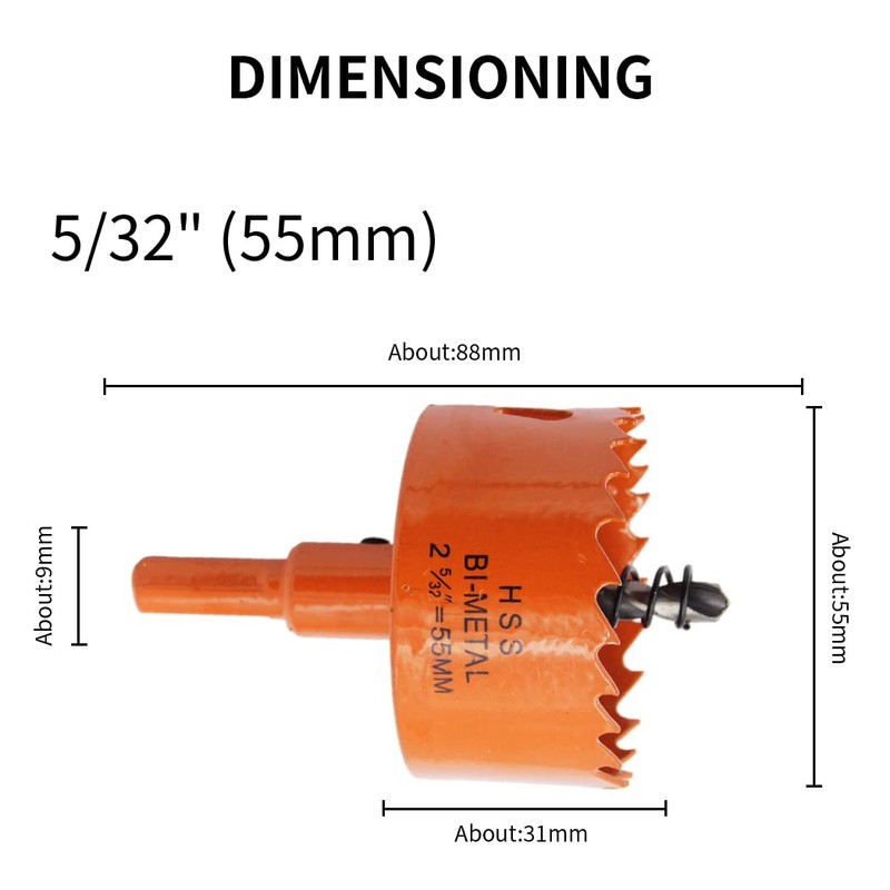 - Size: The total length of the hole saw is 3.3 inches (83 mm), and the cutting diameter is 2.2 inches (55 mm). HSS saw blade thickness is 1.2mm, diameter is 10mm, center drill diameter is 6mm. 1 x 4341 wrench, 1 x spindle, 1 x hex wrench