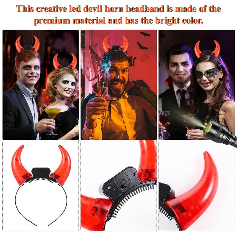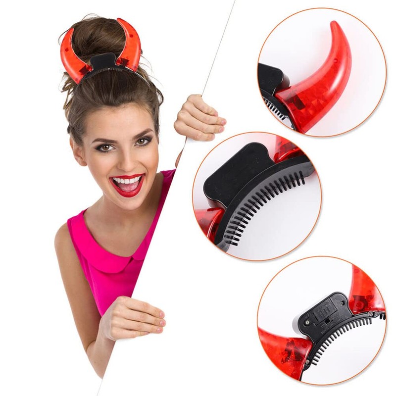 - Devil Horn Hair Accessories: Headband with LED light and horns, light up devil horns hairband powered by button battery (which included).